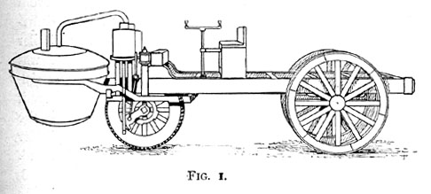 This engine, of which Fig.1 is an illustration, was driven by two single-acting vertical cylinders, 13 in. in diameter. The steam was admitted to the cylinder by a four-way cock; and the pistons worked downwards, acting upon a ratchet-wheel on the driving-axle. Each stroke of one piston gave a quarter of a revolution to the driving-wheel. The boiler was of copper, with a fire-grate, and two rectangular flues serving as chimneys. It could only maintain steam for a quarter of an hour, and the maximum speed attained was 2 1/4 miles per hour on a level road. The machine was fitted with a simple form of steering gear. The French Government took some interest in this notion of a steam carriage, and voted a sum of money towards its construction, with the idea that such a machine might prove useful for military purposes. After the engine had been tried two or three times it overturned in the streets of Paris, and was then locked up in the arsenal, and thus ended its brief career.