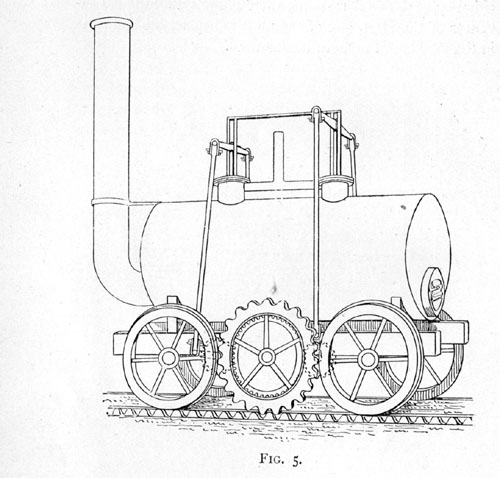 In 1811 Matthew Murray, of Leeds, constructed a Locomotive (illustrated in Fig. 5) for Mr. John Blenkinsop (of the Middleton Colliery, near Leeds), which was put to work in August 1812. Blenkinsop took out a patent for increasing the tractive force by means of a pinion working in a rack-rail. The boiler was cylindrical, with convex ends; there were two vertical double-acting cylinders, 8 in., in diameter with a stroke of 20 in., with pistons acting on cranks working at right angles to each other, which remain the arrangement adopted universally at the present day. Several of these engines were built and proved capable of drawing 94 tons on a level road at 3 1/2 miles an hour, the maximum speed attained with a light load being ten miles an hour. They were inspected in 1816 by the Grand Duke Nicholas afterwards Emperor of Russia, and there is evidence of their being still at work in 1831. Murrays engines may therefore lay claim to be the first engines permanently applied to railways on a commercial basis.