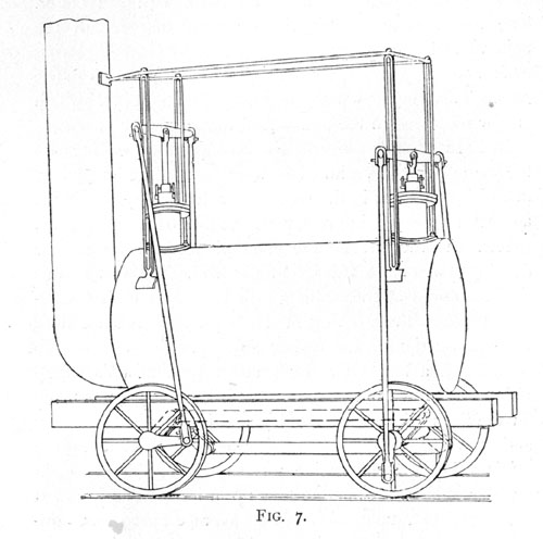 In 1815 Stephenson constructed another engine (illustrated in Fig. 7). It also had vertical cylinders; these were immersed in the boiler, one at each end. Each piston-rod was connected to the centre of a long cross-head or arm, stretching right across the whole width of the engine, and connected by rods to cranks fixed to each wheel. It was intended to coupling-rods working on crank axles, but this idea was abandoned, and the wheels were coupled by an endless chain.