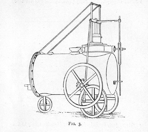 In 1802 we first hear of Richard trevithick as a pioneer of locomotive engineering. In that year, with his cousin Vivian, he took out a patent for a high-pressure engine and its application to steam-carriages, and in the same year he made a model of a steam-carriage (Fig 3), the original of which is now in the South Kensington Museum.
