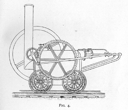 In the meantime, other brains had been at work on the locomotive. Mr. Blackett, the proprietor of Wylam Colliery near Newcastle-on-Tyne, wrote to trevithick on the subject; and in 1811 one of the latters engines was sent from Cornwall to Newcastle. It was, however, never used as a locomotive, but was subsequently employed as a stationary engine. A very primitive machine it must have been, as George Stephenson, who had never before seen a locomotive, upon inspecting it declared he could make a better one himself. William Hedley, Mr. Blacketts colliery inspector, set to work to construct a locomotive, having before him trevithicks engines, and one of Blenkinsops, which had been sent to work on the Wylam Railway would have coat about £8000, in addition to the expenses involved by adopting his patent. Hedley seems to have understood the insufficiency of adhesion between the rails and the driving wheels of light engines; yet he determined to adopt the system of direct acting driving-wheels, and to find means to overcome the difficulty. The result of his labours was that in 1813 he produced an engine which worked by the friction of its driving-wheels on smooth rails.
