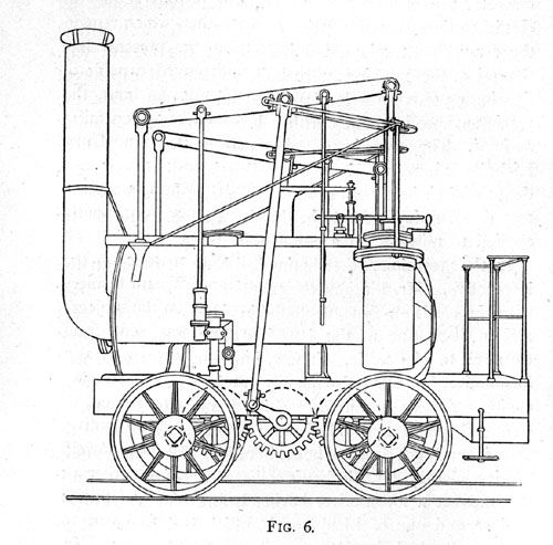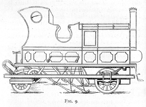 In 1815 Stephenson constructed another engine (illustrated in Fig. 7). It also had vertical cylinders; these were immersed in the boiler, one at each end. Each piston-rod was connected to the centre of a long cross-head or arm, stretching right across the whole width of the engine, and connected by rods to cranks fixed to each wheel. It was intended to coupling-rods working on crank axles, but this idea was abandoned, and the wheels were coupled by an endless chain.