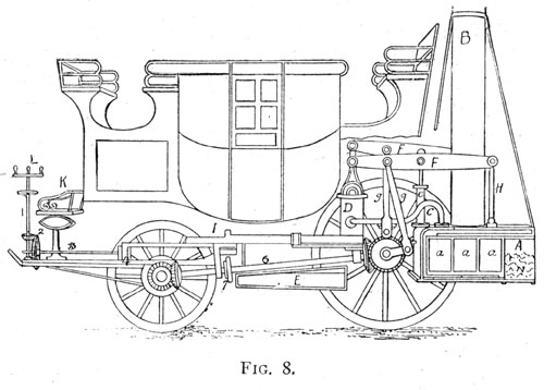 Messrs. Burstall & Hill, of London, constructed a steam-coach (Fig 8), which was made the subject of various experimental trials. The greatest speed attained was from three to four miles an hour, and there were repeated failures through defects in the boiler. The general arrangement of the machinery of this engine was the same as that of the Perseverance, which was entered by Mr. Burstall for the Rainhill contest in 1829. The following descriptions appears in an old number of the Edinburgh Journal of Science - A represents the boiler, which is formed of a stout cast-iron or other suitable metal flue, enclosed in a wrought-iron or copper case, as seen in section, where A is the place for fuel, and a a a are parts of the flue, the top being formed into a number of shallow trays or receptacles for containing a small quantity of water in a state of being converted into steam, which is admitted from the reservoir by a small pipe. B is the chimney, arising from the centre flue; at D are the two cylinders, one behind the other, which are fitted up with pistons and valves, or cocks, in the usual way for the alternate, action of steam above and below the pistons.
